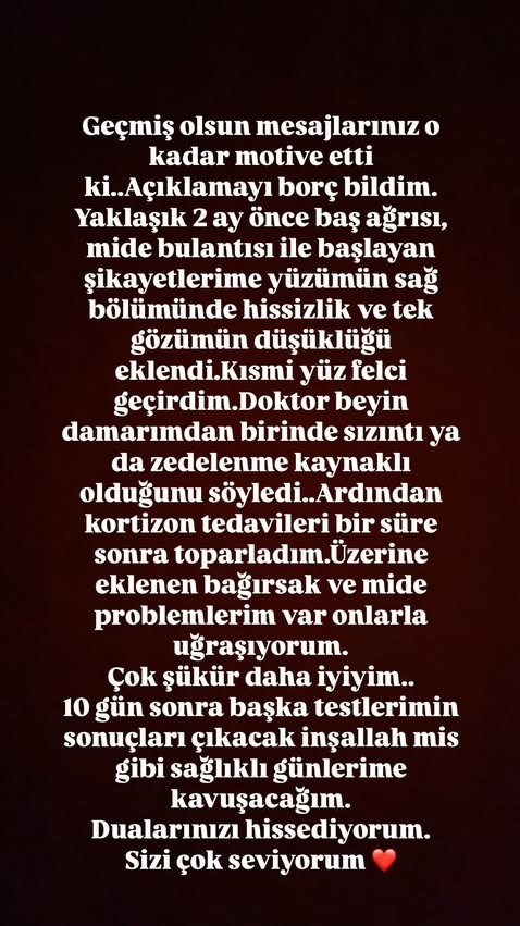 Aslan açıklamasına şu sözlerle devam etti: "Doktor, beyin damarımdan birinde sızıntı ya da zedelenme kaynaklı olduğunu söyledi. Ardından kortizon tedavileriyle bir süre sonra toparladım. Üzerine eklenen bağırsak ve mide problemlerim var, onlarla uğraşıyorum. Çok şükür daha iyiyim. 10 gün sonra başka testlerimin sonuçları çıkacak, inşallah mis gibi sağlıklı günlerime kavuşacağım. Dualarınızı hissediyorum. Sizi çok seviyorum."
